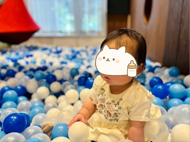 ボールプールに入れた瞬間、娘がボールに埋もれていてめちゃくちゃ可愛かったです。